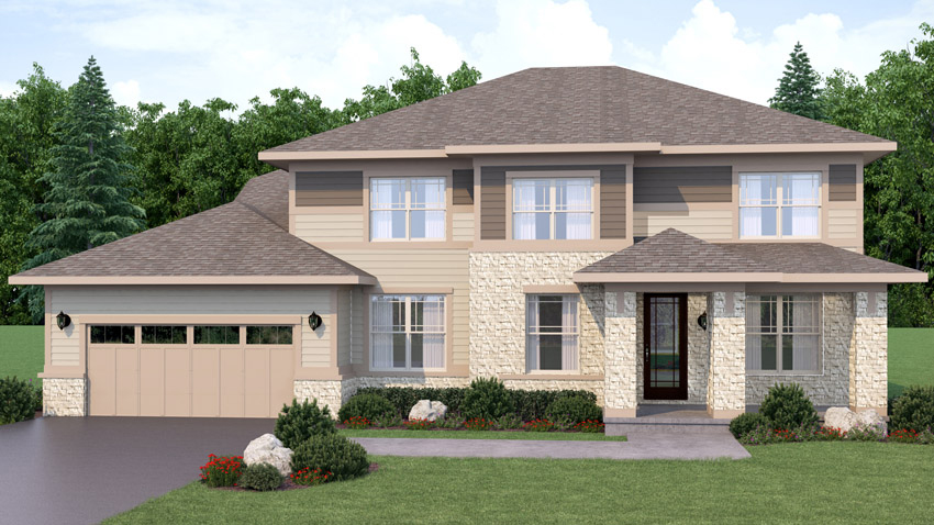 Exterior rendering of a 2-story home from the front, Bethpage floor plan. Northern Craftsman