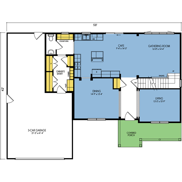 A part of our dream series, the tamarack floor plan features 3 bedrooms and 1.5 bathrooms with a foot print of 44x30 feet and 1342 total square feet of living space.