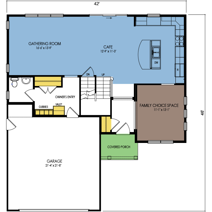 A part of our Dream Series, the Blue Spruce floor plan features 3 bedrooms, 2.5 bathrooms, and a 2-car garage, with a footprint of 42x46 feet and 2083 total square feet of living space. Floor Plan #DR280