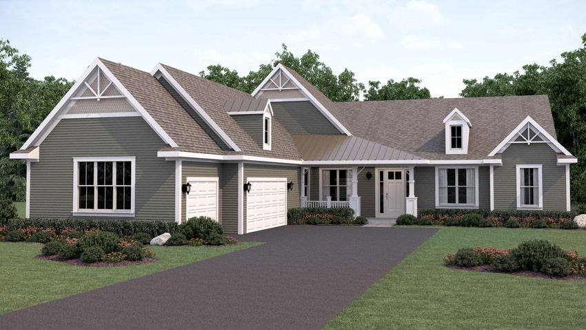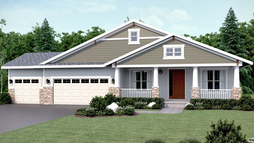 Exterior rendering of a 2-story home in the Southern Classic style. There is a driveway and front yard leading up to a 3-car garage and a front door with a small covered porch. The home's siding is a combination of tan lap siding and reddish brick. Southern Classic