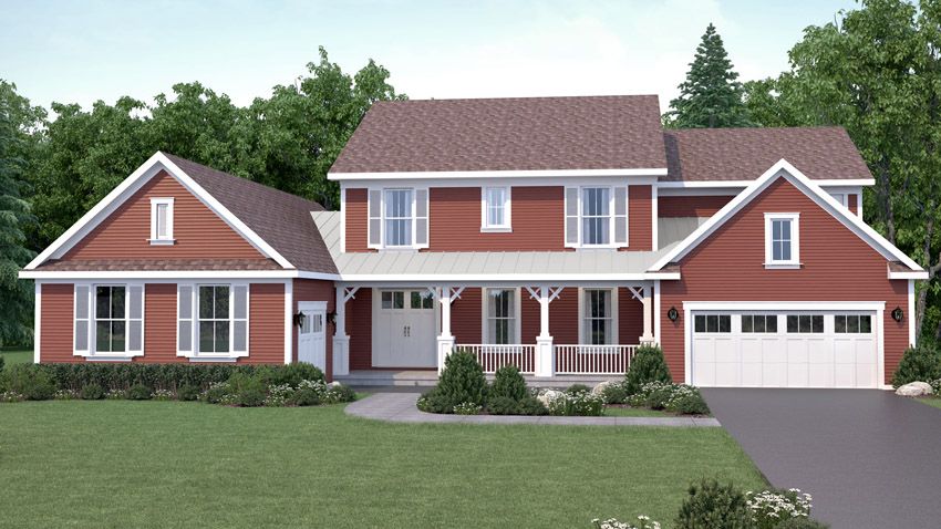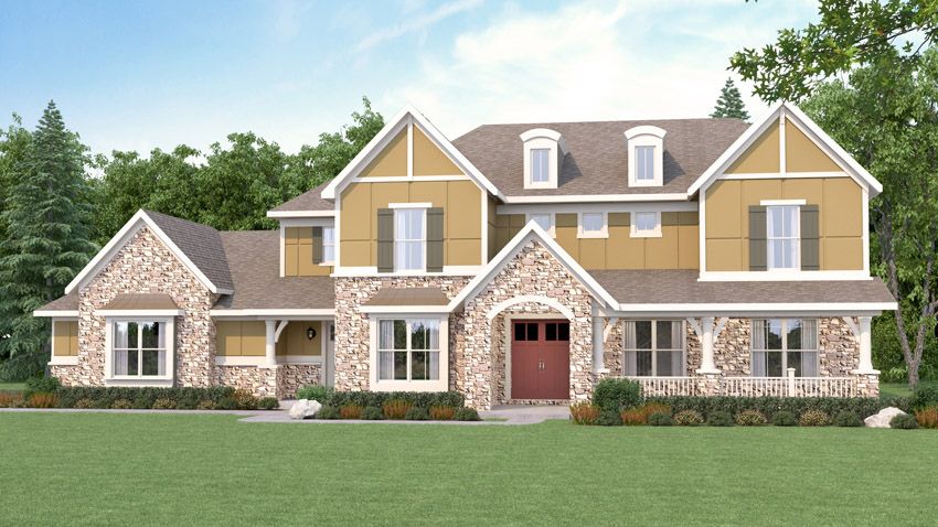 Exterior rendering of a 2-story home in the English Country style. There is a driveway and front yard leading up to a 3-car garage and a front door with a small covered porch. The home's siding is a combination of red brick and tan tudor-style vertical siding. English Country